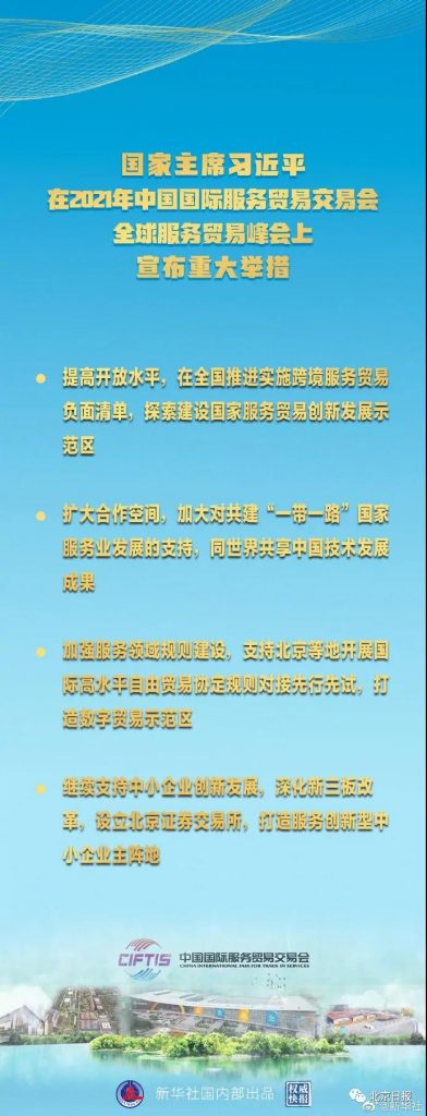 习近平强调,中国将提高开放水平,在全国推进实施跨境服务贸易负面清单,探索建设国家服务贸易创新发展示范区;扩大合作空间,加大对共建“一带一路”国家服务业发展的支持,同世界共享中国技术发展成果;加强服务领域规则建设,支持北京等地开展国际高水平自由贸易协定规则对接先行先试,打造数字贸易示范区;继续支持中小企业创新发展,深化新三板改革,设立北京证券交易所,打造服务创新型中小企业主阵地。